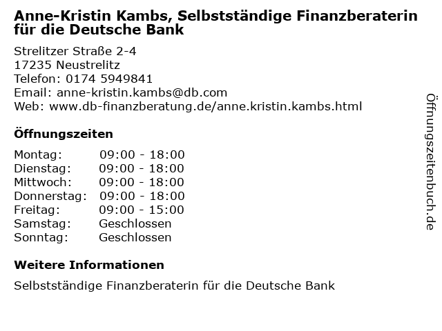 Branchen & Suchbegriffe zu Anne-Kristin Kambs, Selbstständige Finanzberaterin für die Deutsche Bank:anne, bank, deutsche, finanzberaterin, kambs, kristin, selbstständige |
