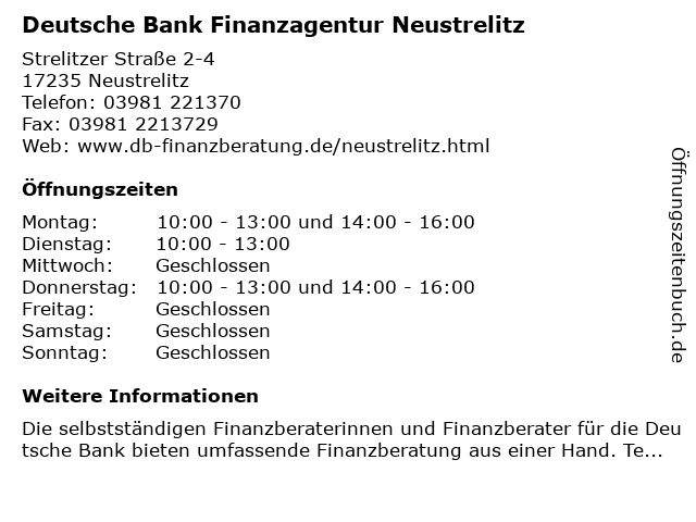 Branchen & Suchbegriffe zu Deutsche Bank Finanzagentur Neustrelitz:bank, bankomat, deutsche, finanzagentur, neustrelitz |