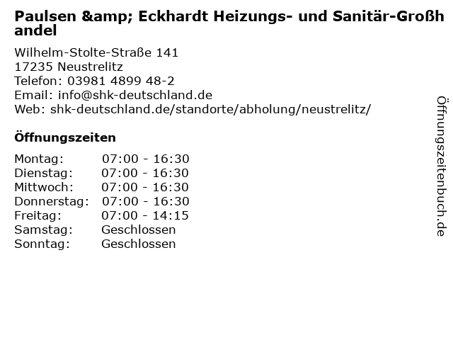 1 Egbert Wilts GmbH & Co. KG - Großhandel für Maler und Bodenleger (Entfernung: 2,86 km) Gewerbepark Ost 8, 17235 Neustrelitz 2 4 Paulsen & Eckhardt GmbH Sanitär Abholcenter (Entfernung: 30,78 km) Hellfelder Str. 3, 17039 Trollenhagen 5 Paulsen & Eckhardt GmbH Sanitär Bäderwelten Ausstellung (Entfernung: 30,78 km) Hellfelder Str. 3, 17039 Trollenhagen 6 Paulsen & Eckhardt GmbH Sanitär- und Heizungsgroßhandel (Entfernung: 31,68 km) Eichholzstr. 1, 17192 Waren |