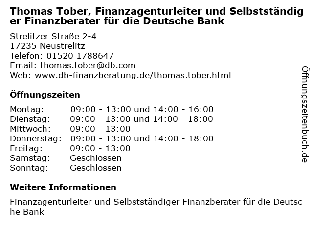 1 Oliver Rinke, Selbstständiger Finanzberater für die Deutsche Bank (Entfernung: 0,00 km) Strelitzer Straße 2-4, 17235 Neustrelitz 6 |