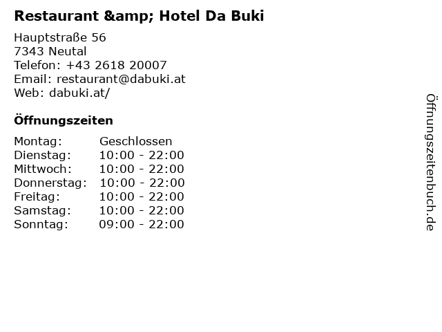 Öffnungszeiten Restaurant & Hotel Da Buki in Neutal anzeigen | |
