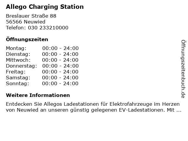 | Öffnungszeiten Allego Charging Station in Neuwied anzeigen | |