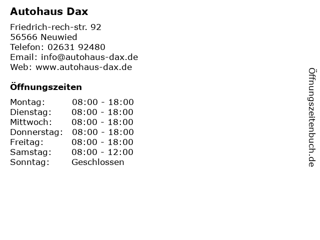 | Öffnungszeiten Autohaus Dax in Neuwied anzeigen | |