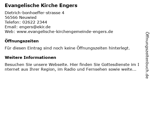 | Öffnungszeiten Evangelische Kirche Engers in Neuwied anzeigen | |