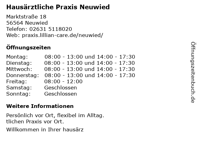 | Öffnungszeiten Hausärztliche Praxis Neuwied in Neuwied anzeigen | |