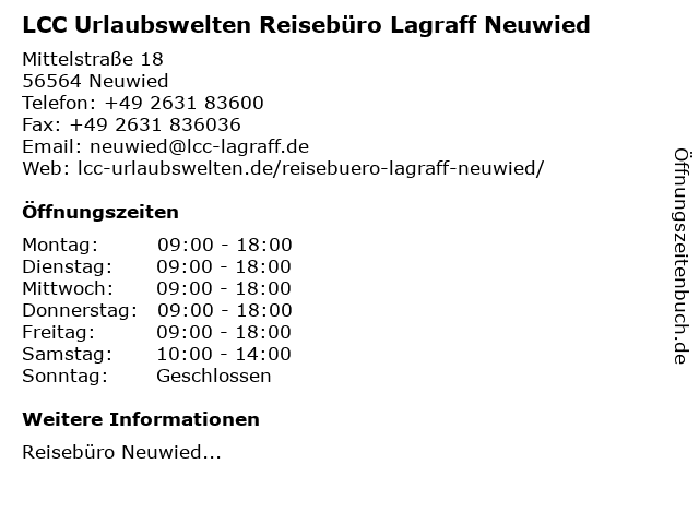 1 Reisebüro Lagraff Lufthansa City Center Business Travel (Entfernung: 0,02 km) Mittelstraße 18, 56564 Neuwied 2 FIRST REISEBÜRO - Happy Family / Reisebüro Lagraff (Entfernung: 0,79 km) Engerser Landstraße 14, 56564 Neuwied 5 LCC Urlaubswelten Reisebüro Lagraff Bad Hönningen (Entfernung: 14,07 km) Bahnhofstraße 2, 53557 Bad Hönningen 6 Reisebüro Lagraff Lufthansa City Center Linz (Entfernung: 19,79 km) Mittelstraße 20, 53545 Linz am Rhein |