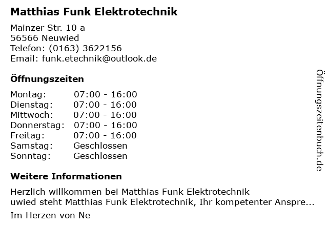 | Öffnungszeiten Matthias Funk Elektrotechnik in Neuwied anzeigen | |