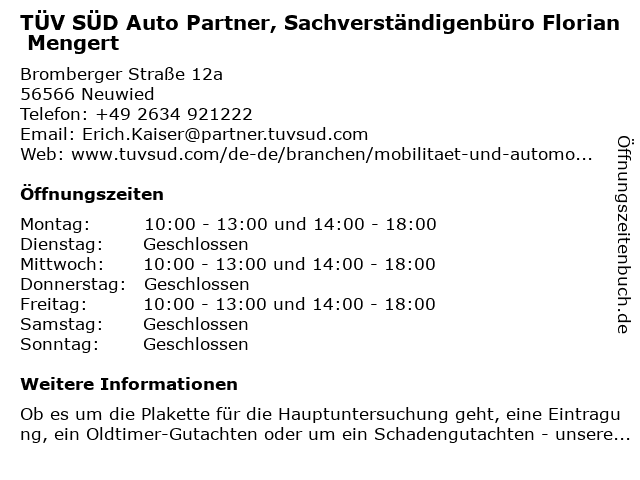 1 TÜV SÜD Auto Partner, Sachverständigenbüro Florian Mengert (Entfernung: 9,99 km) Wankelburgsweg 15a, 56637 Plaidt 6 |