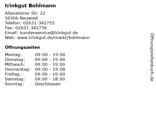 | Öffnungszeiten trinkgut Bohlmann in Neuwied anzeigen | |