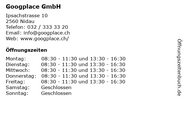 | Öffnungszeiten Googplace GmbH in Nidau anzeigen | |