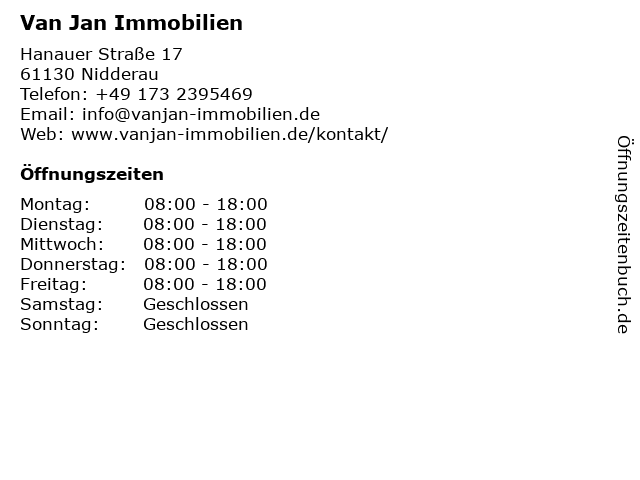 | Öffnungszeiten Van Jan Immobilien in Nidderau anzeigen | |