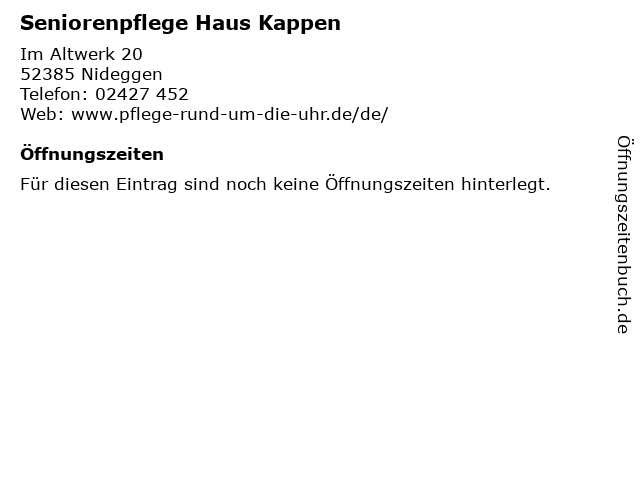 | Öffnungszeiten Seniorenpflege Haus Kappen in Nideggen anzeigen | |