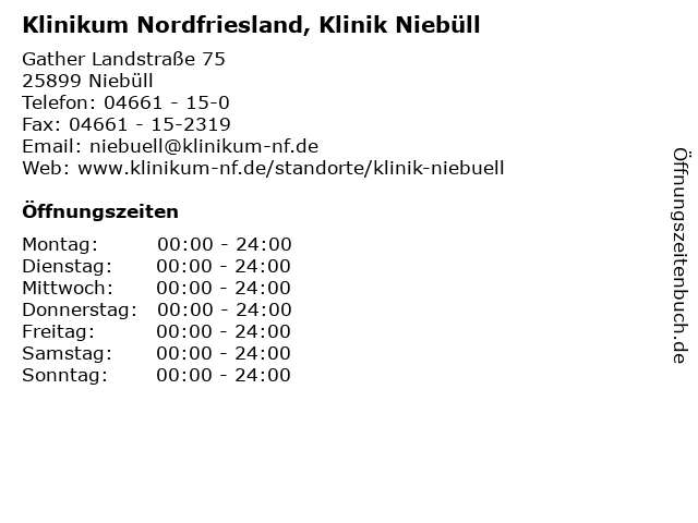1 Klinikum Nordfriesland, Klinik Niebüll - KVSH-Anlaufpraxis (Notfallpraxis) (Entfernung: 0,00 km) Gather Landstraße 75, 25899 Niebüll 2 Nordfriesland Zimmerei Ralf Petersen, Jochen Petersen und Swen Möller (Entfernung: 1,20 km) Ostring 6, 25899 Niebüll 6 |