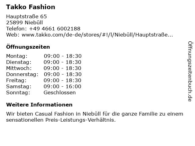 | Öffnungszeiten Takko Fashion in Niebüll anzeigen | |