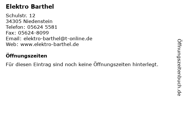 | Öffnungszeiten Elektro Barthel in Niedenstein anzeigen | |