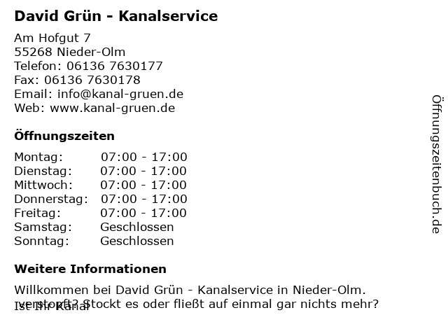| Öffnungszeiten David Grün - Kanalservice in Nieder-Olm anzeigen | |