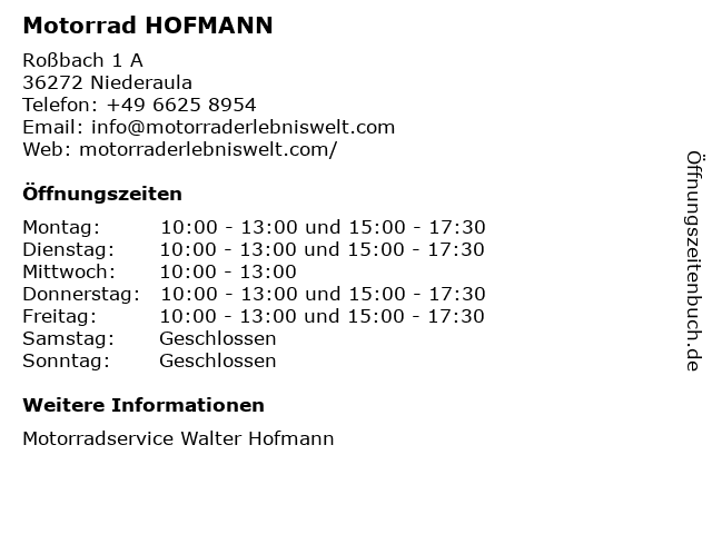 | Öffnungszeiten Motorrad HOFMANN in Niederaula anzeigen | |