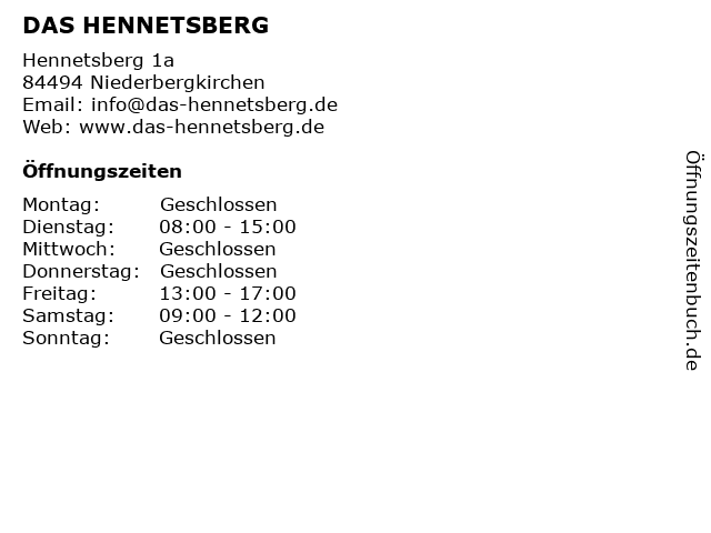 | Öffnungszeiten DAS HENNETSBERG in Niederbergkirchen anzeigen | |