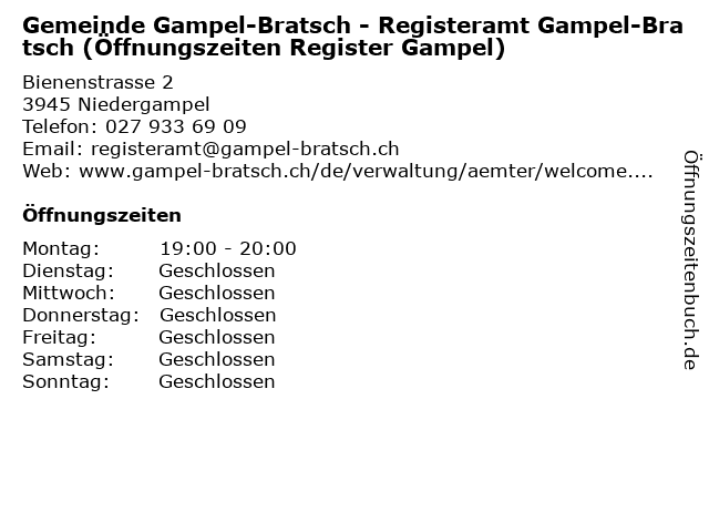 2 Gemeinde Gampel-Bratsch - Registeramt Gampel-Bratsch (Öffnungszeiten Register Bratsch) (Entfernung: 0,00 km) Bienenstrasse 2, 3945 Niedergampel 6 |
