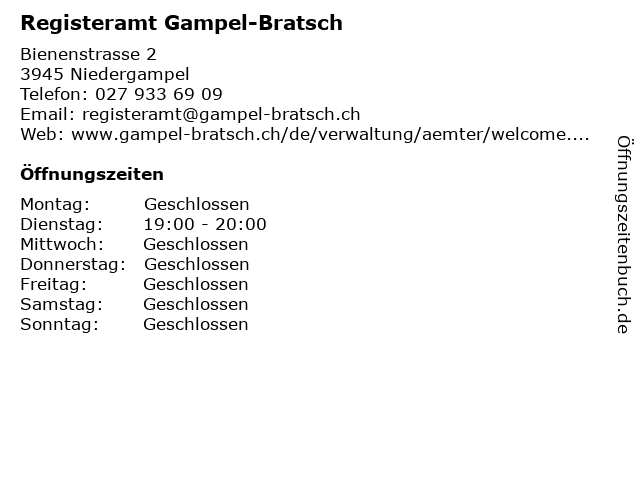 1 Gemeinde Gampel-Bratsch - Registeramt Gampel-Bratsch (Öffnungszeiten Register Gampel) (Entfernung: 0,00 km) Bienenstrasse 2, 3945 Niedergampel 6 |
