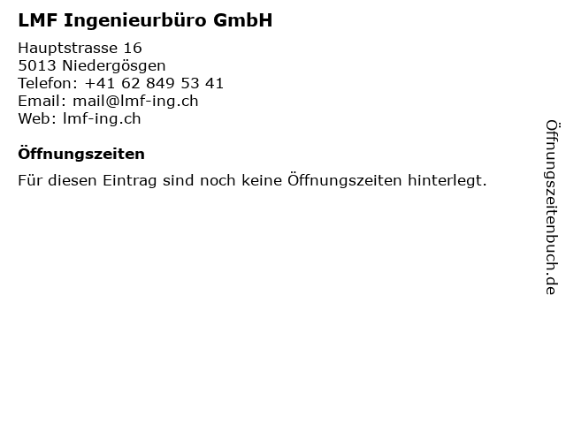 | Öffnungszeiten LMF Ingenieurbüro GmbH in Niedergösgen anzeigen | |