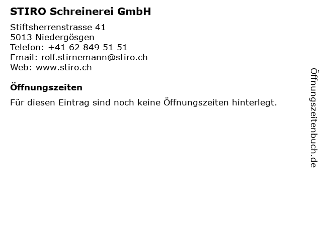 | Öffnungszeiten STIRO Schreinerei GmbH in Niedergösgen anzeigen | |