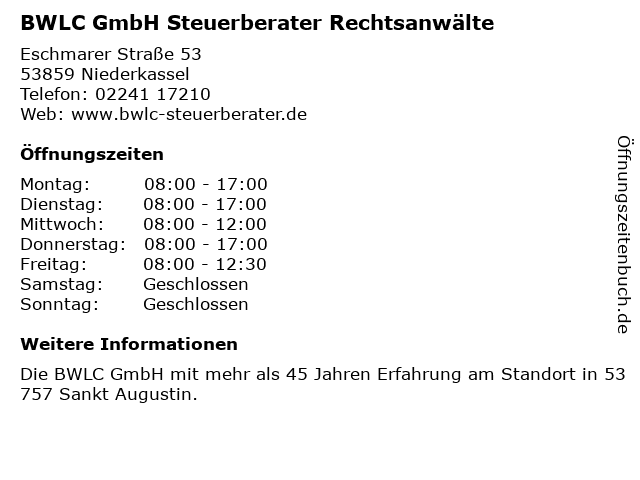 Branchen & Suchbegriffe zu BWLC GmbH Steuerberater Rechtsanwälte:bwlc, rechtsanwälte, steuerberater, unternehmensmanagementberatung, wirtschaftsprüfer |