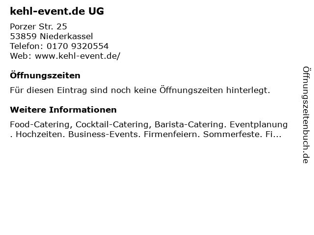 | Öffnungszeiten kehl-event.de UG in Niederkassel anzeigen | |