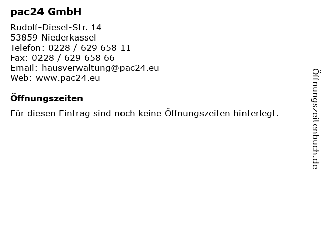 | Öffnungszeiten pac24 GmbH in Niederkassel anzeigen | |