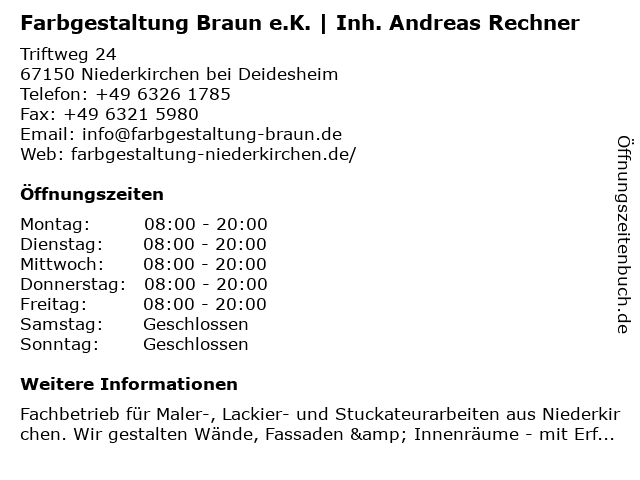 | Branchen & Suchbegriffe zu Farbgestaltung Braun e.K. | Inh. Andreas Rechner:andreas, braun, e.k., ein- und ausräum service, farbgestaltung, farbgestaltung braun, farbgestaltung braun e.k., fassadengestaltung, kalkputz, kompetente beratung, lackiererarbeiten, lehmputz, malerarbeiten, malerarbeiten bad dürkheim, malerbetrieb niederkirchen, rechner, spachteltechnik, streichputz, stuck, stuckateurarbeiten, tapezierarbeiten, trockenbau, wärmedämmung |