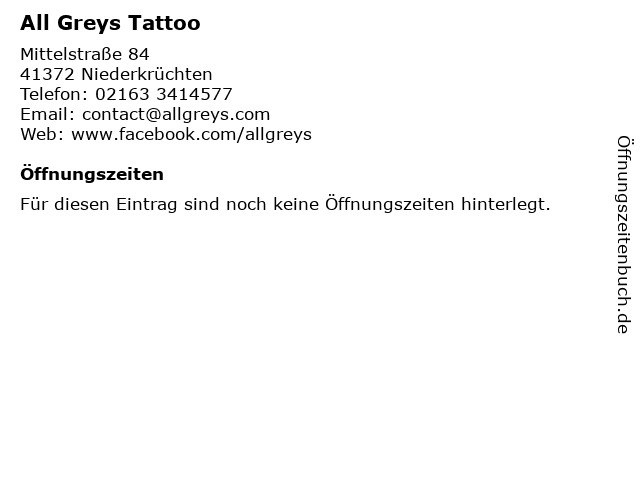 | Öffnungszeiten All Greys Tattoo in Niederkrüchten anzeigen | |