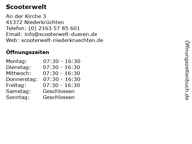 | Öffnungszeiten Scooterwelt in Niederkrüchten anzeigen | |
