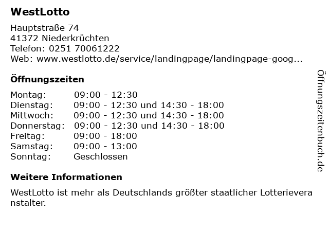 | Öffnungszeiten WestLotto in Niederkrüchten anzeigen | |