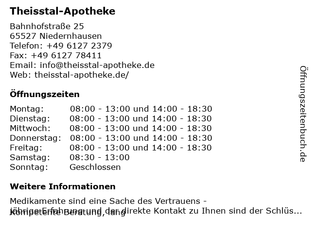 | Öffnungszeiten Theisstal-Apotheke in Niedernhausen anzeigen | |
