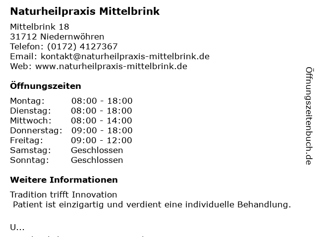 1 Naturwarenladen Mittelbrink , Inhaber Rudolf Wiegert Würffel (Entfernung: 0,06 km) Mittelbrink 7, 31712 Niedernwöhren 6 |