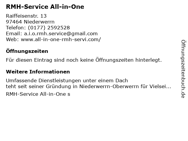 | Öffnungszeiten RMH-Service All-in-One in Niederwerrn anzeigen | |
