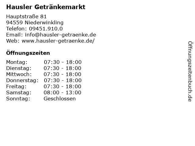 | Öffnungszeiten Hausler Getränkemarkt in Niederwinkling anzeigen | |