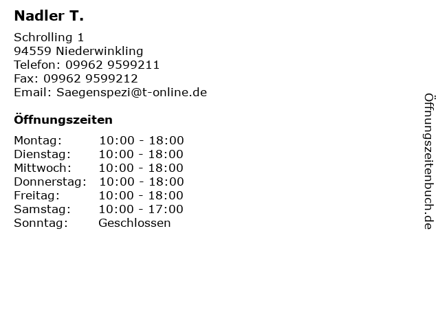 | Öffnungszeiten Nadler T. in Niederwinkling anzeigen | |