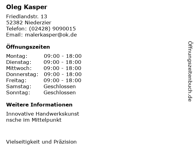 | Öffnungszeiten Oleg Kasper in Niederzier anzeigen | |