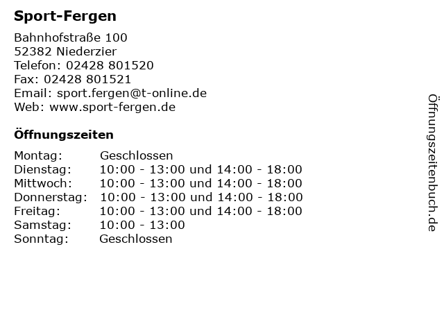 | Öffnungszeiten Sport-Fergen in Niederzier anzeigen | |