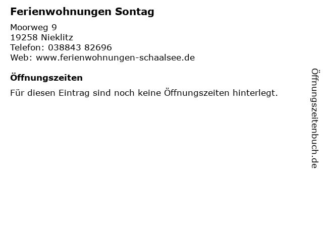| Öffnungszeiten Ferienwohnungen Sontag in Nieklitz anzeigen | |