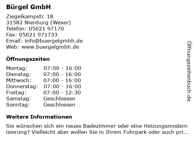 | Öffnungszeiten Bürgel GmbH in Nienburg (Weser) anzeigen | |