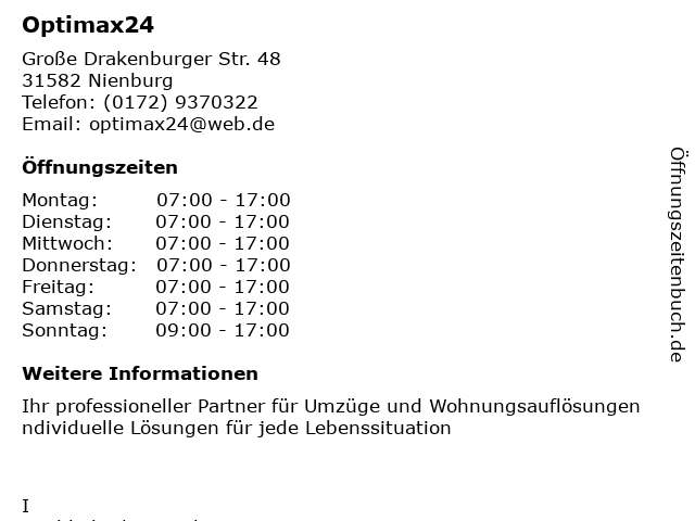 | Öffnungszeiten Optimax24 in Nienburg anzeigen | |