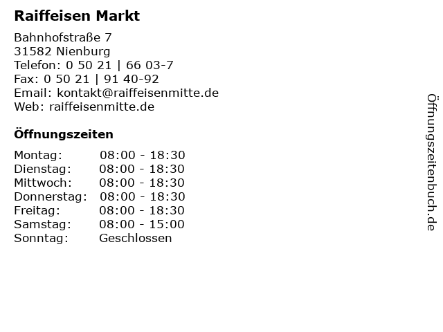 | Öffnungszeiten Raiffeisen Markt in Nienburg anzeigen | |