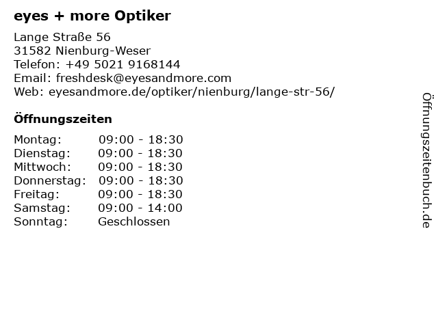 | Öffnungszeiten eyes + more Optiker in Nienburg-Weser anzeigen | |