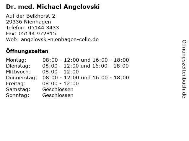 | Öffnungszeiten Dr. med. Michael Angelovski in Nienhagen anzeigen | |