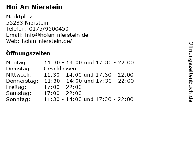 | Öffnungszeiten Hoi An Nierstein in Nierstein anzeigen | |