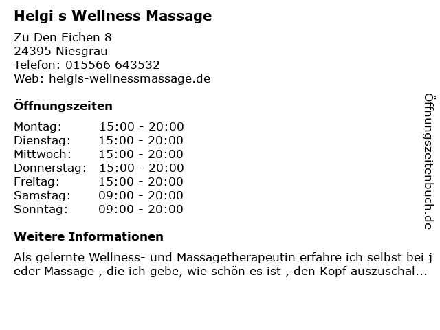 | Öffnungszeiten Helgi s Wellness Massage in Niesgrau anzeigen | |