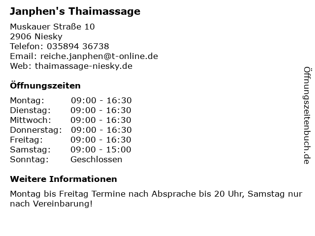 | Öffnungszeiten Janphen's Thaimassage in Niesky anzeigen | |