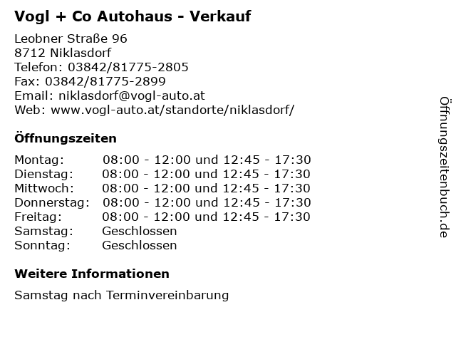 1 Vogl + Co Autohaus - Werkstatt und Ersatzteillager (Entfernung: 0,00 km) Leobner Straße 96, 8712 Niklasdorf 6 Vogl + Co Autohaus - Werkstatt und Ersatzteillager (Entfernung: 29,76 km) Wiener Straße 40, 8720 Knittelfeld |